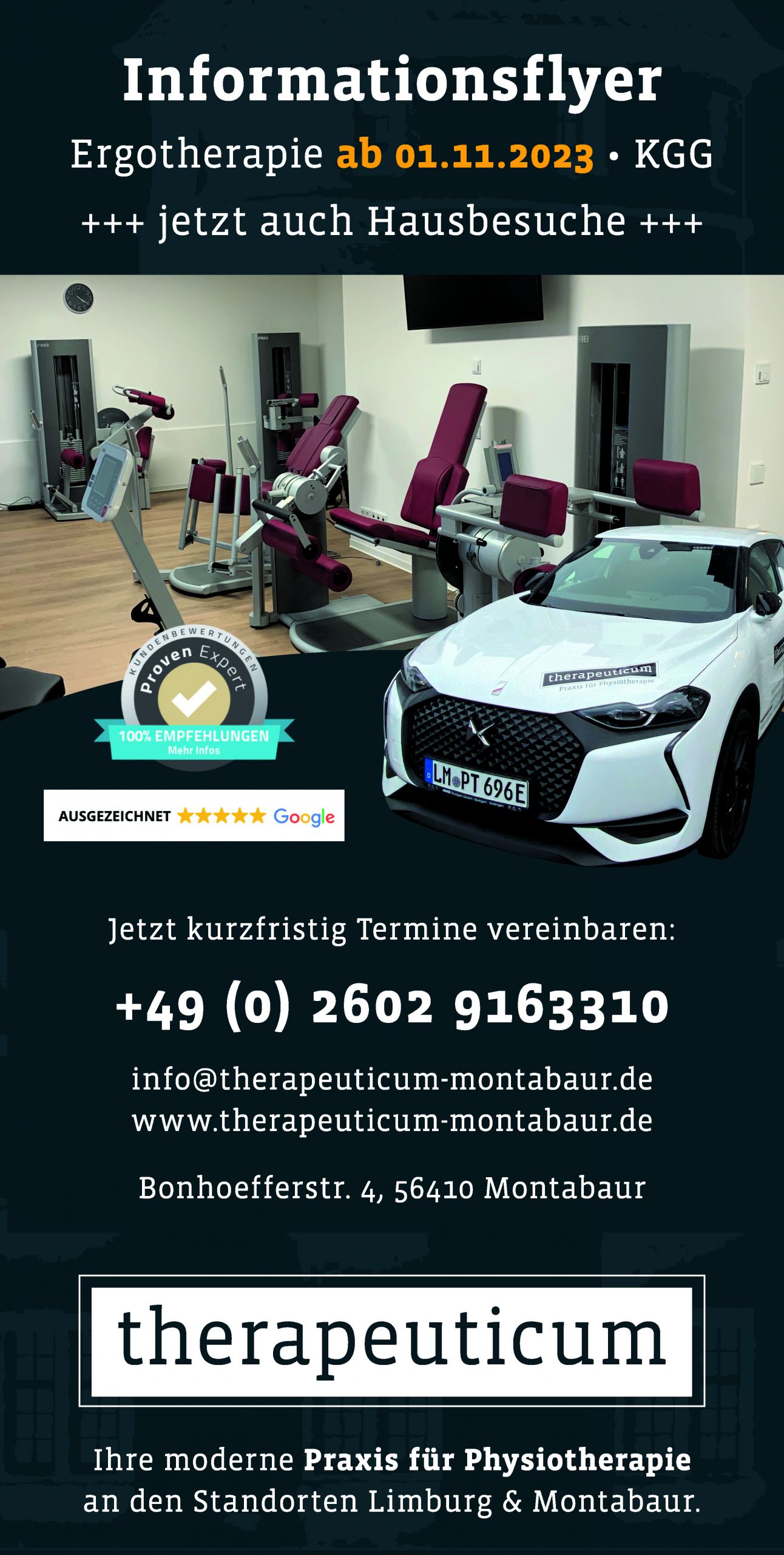 Nächste Woche werden in Montabaur und Wirges unsere neuen Flyer mit Infos zu unserem therapeutischen Angebot verteilt. Vorab können sind sie aber bereits hier zu sehen.